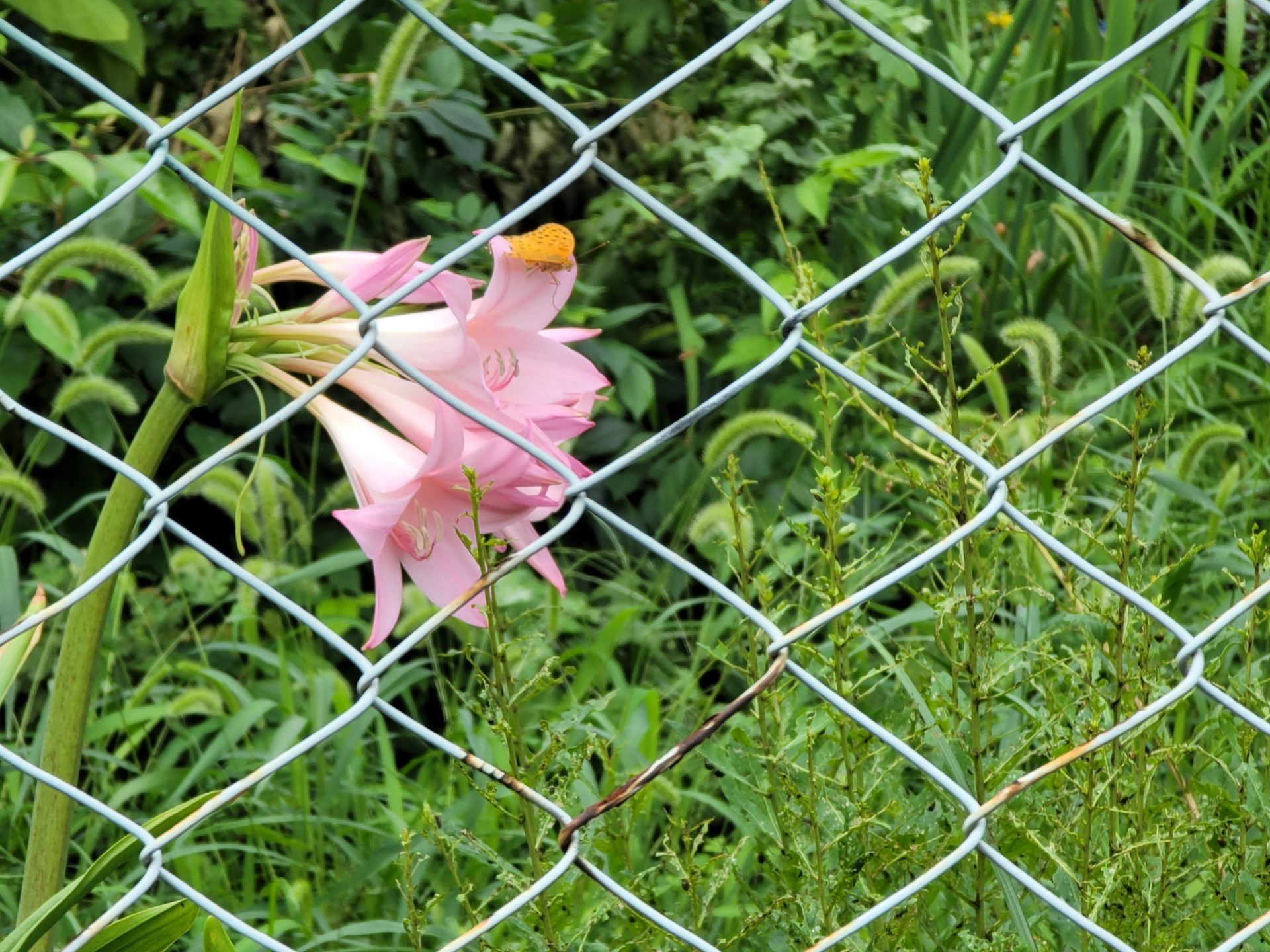 しばらく可憐なピンクに見とれていると、ヒラヒラハラハラ、1匹のヒョウモンチョウが飛んできて迷わずマクリナムの長い花弁にとまりました。