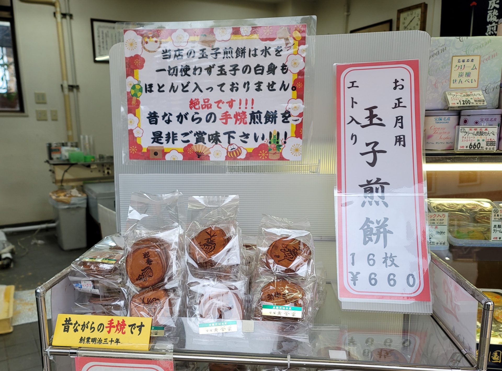 黄金屋さんの店頭のガラスケースには、看板商品である「炭酸せんべい」のほか、レモン・イチゴ・チョコ・抹茶の4種のクリームを挟んだ「クリームタンサンセンベイ」や、卵とショートニングを使った「宝塚せんべい」が並んでいました。たくさん買っても荷物が軽いというのも炭酸せんべいのいいところ。せっかく来たので、全部の種類のお煎餅を購入。また、陳列棚に出ていた、この時期だけの「干支入り玉子煎餅」も合わせて購入しました。