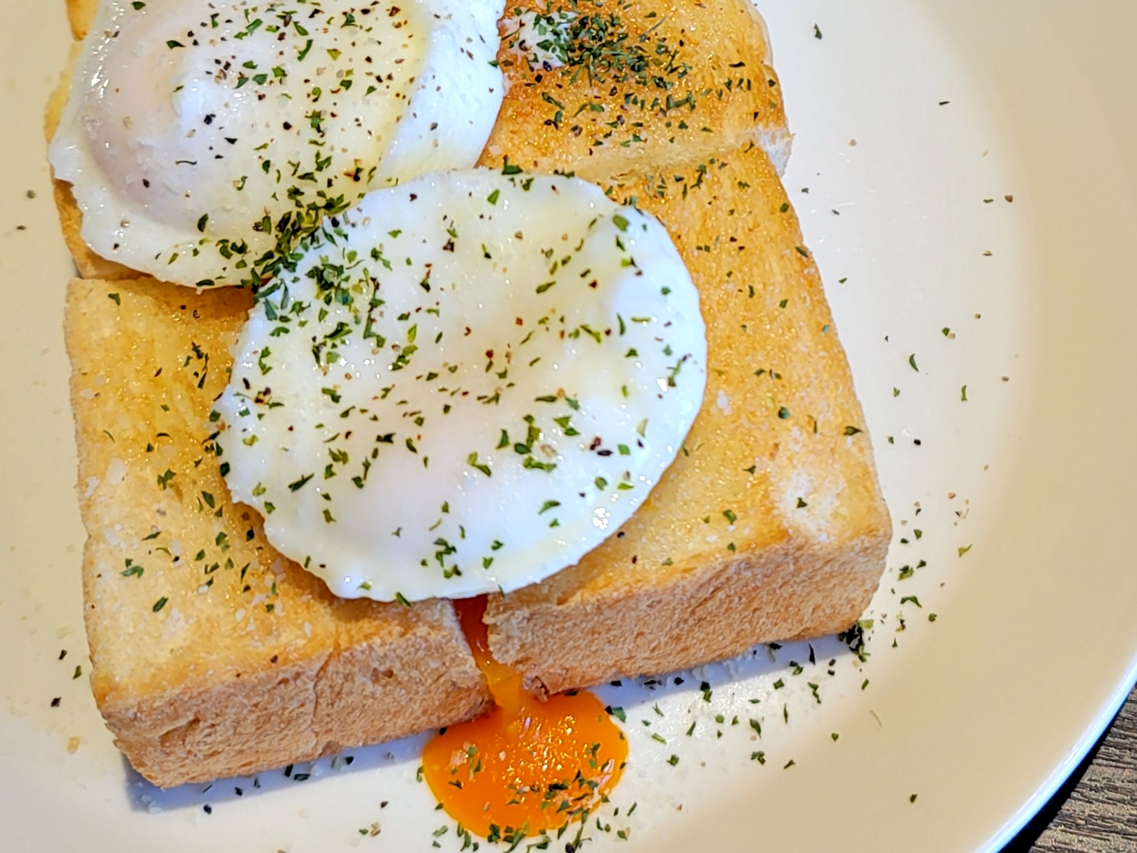 パンの種類は山形パンの「月」を選びました。高さのある厚切りパンは、もっちりふんわり。ポーチドエッグともあんバターとも完璧なマッチングでした。