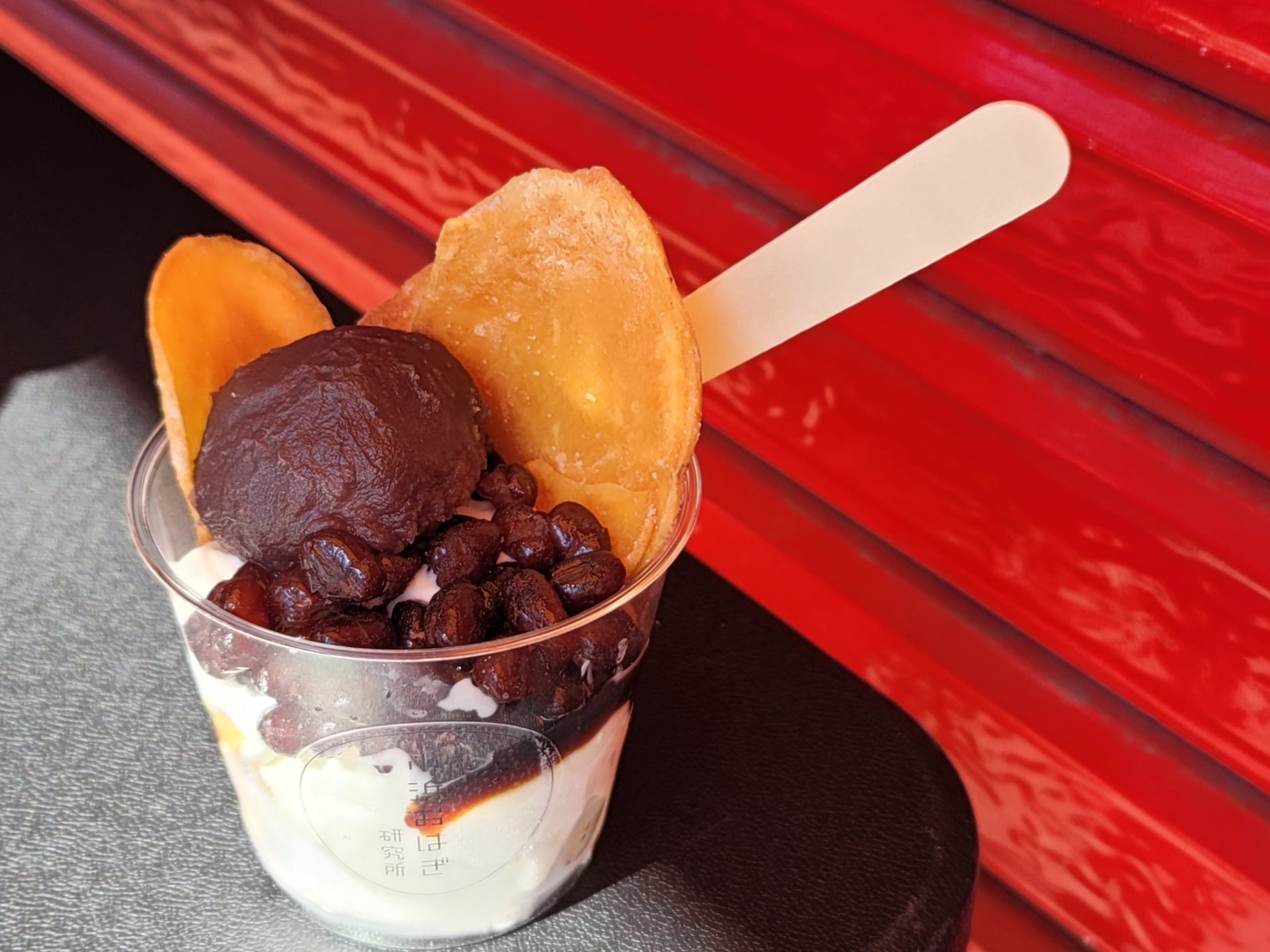 おはぎはもとより、サツマイモチップス、アイスクリームなど一つ一つの具材がとてもおいしくて、「食べればすきになる」の言葉通り、パフェもおはぎも好きになってしまう一品でした。
