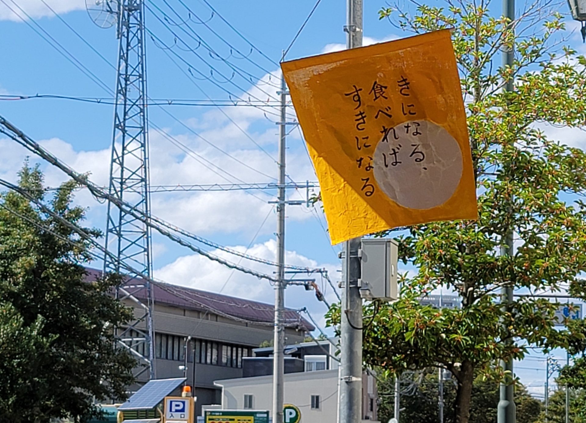軒先の、その黄色い吊り下げ旗をよく見てみると、「気になる 食べればすきになる」とあります。