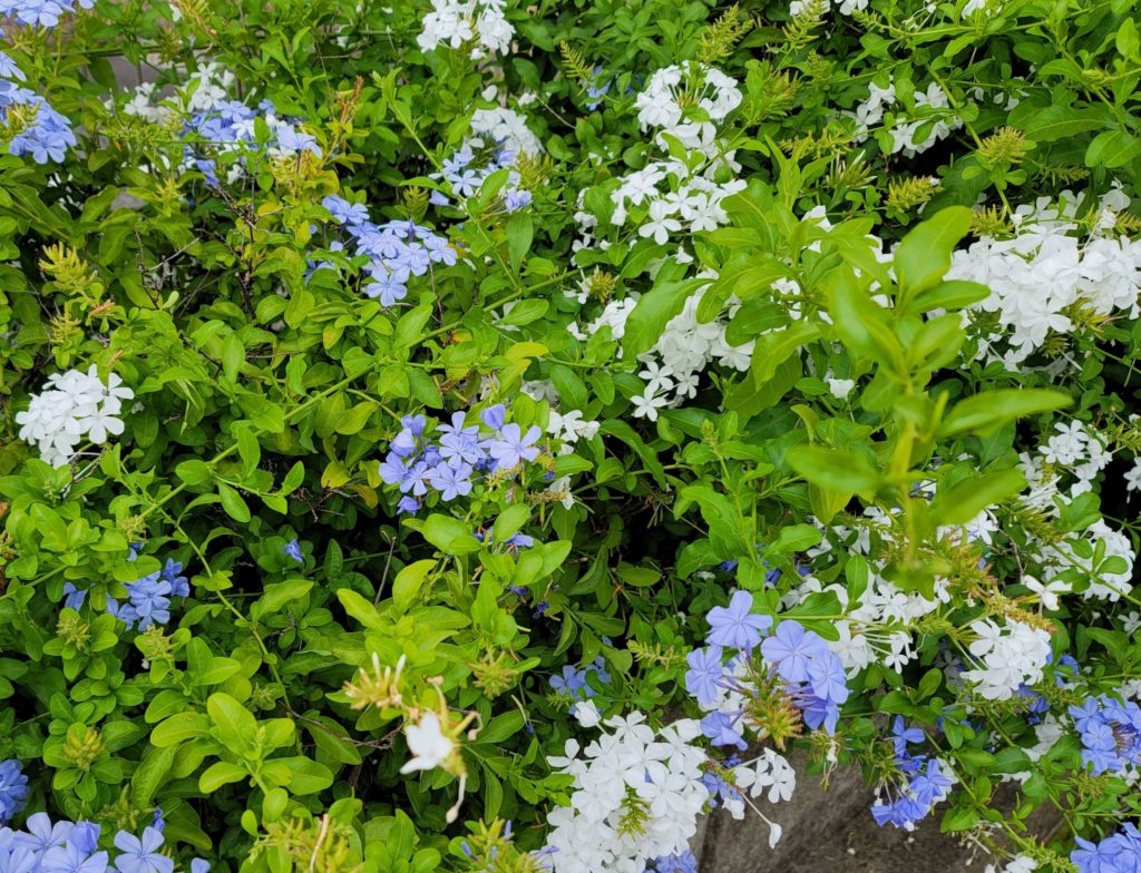 瑠璃茉莉(ルリマツリ)がきれいです。とても可憐な名前のこの花は、花姿がジャスミン(茉莉花)に似ていて、花色が瑠璃色をしていることから、名付けられたそう。