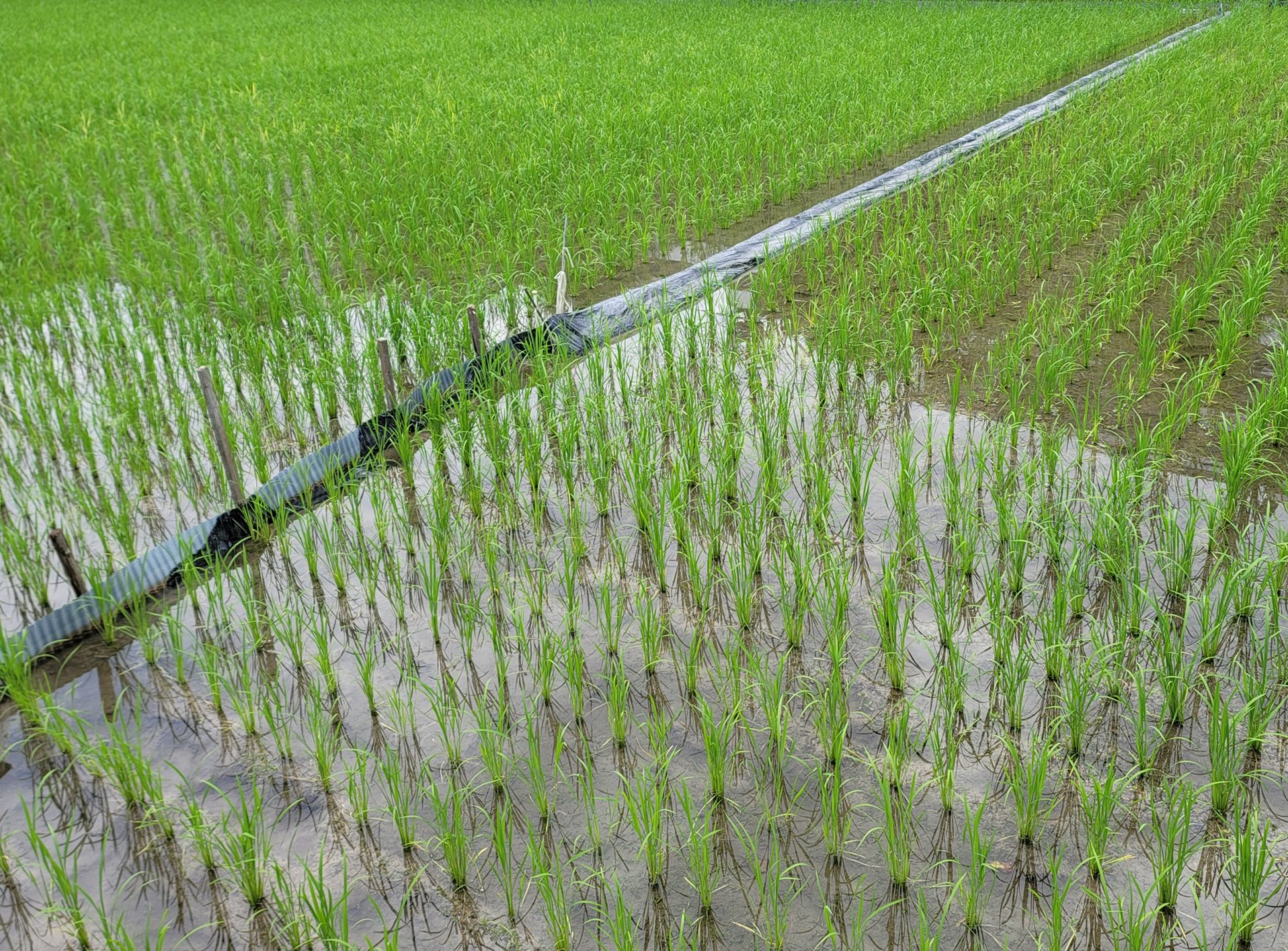 今ごろの水田は、稲が青々としていて目に鮮やかです。一本一本がぴんと伸びてきちんと整列している様子も、とても清々しい気持ちにさせてくれます。